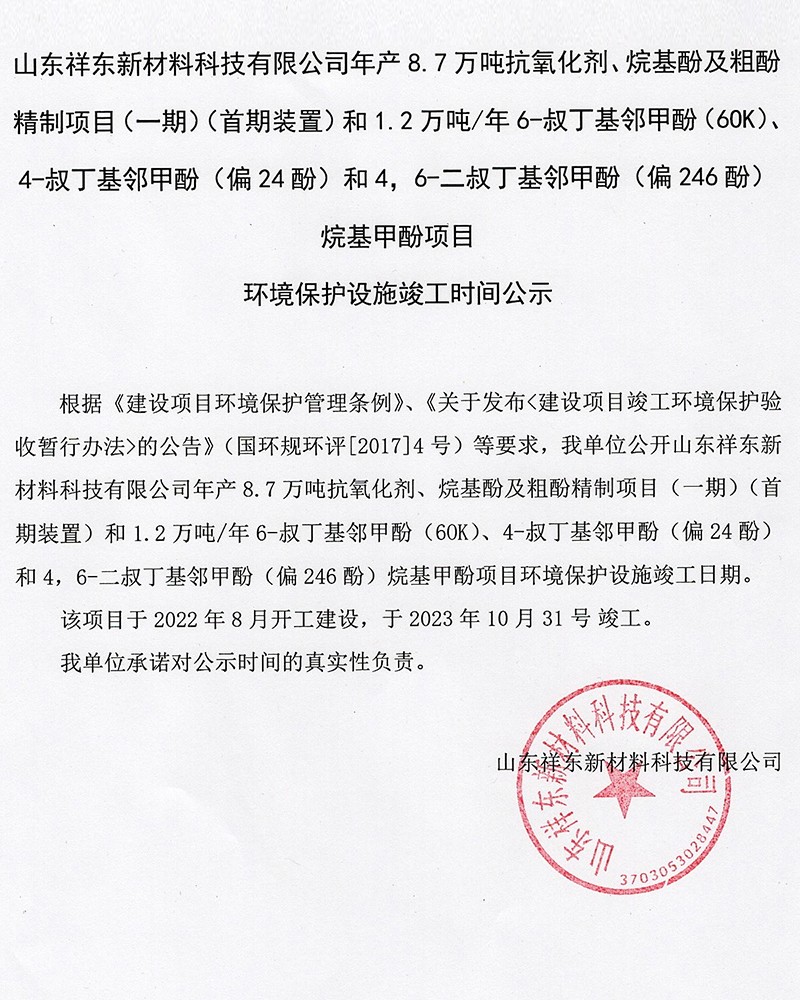 烷基甲酚項目環境保護設施竣工時間公示