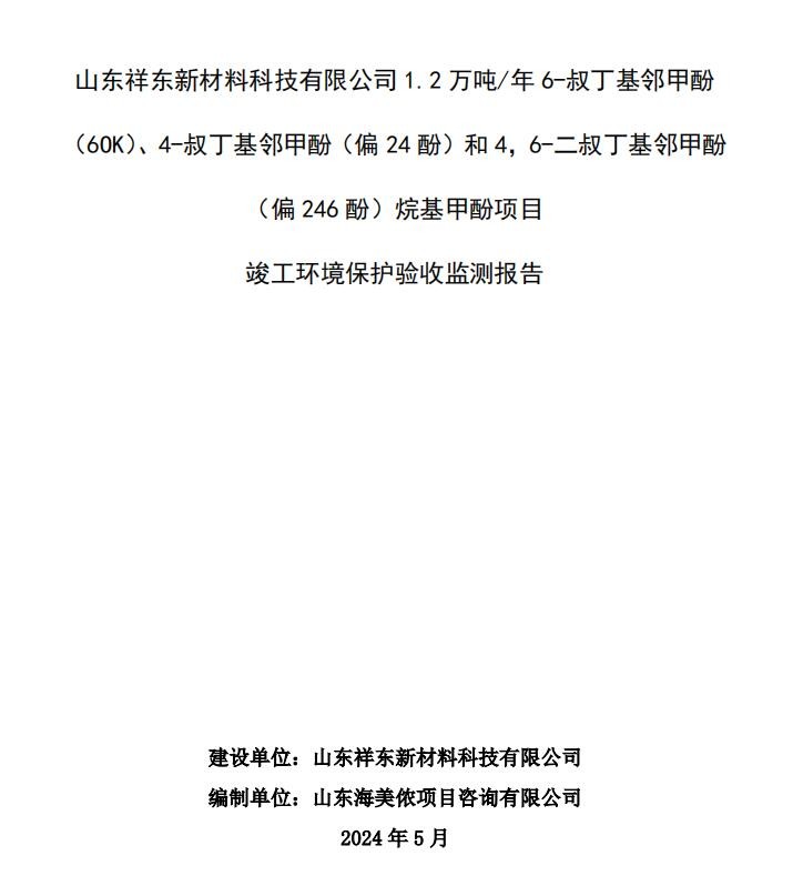項(xiàng)目名稱:山東祥東新材料科技有限公司1.2萬(wàn)噸/年6-叔丁基鄰甲酚(6OK)、4-叔丁基鄰甲酚(偏24酚)和4,6-二叔丁基鄰甲酚(偏246酚)烷基甲酚項(xiàng)目